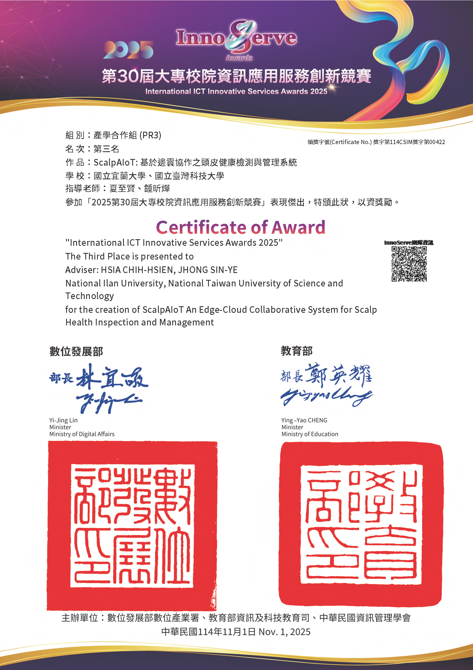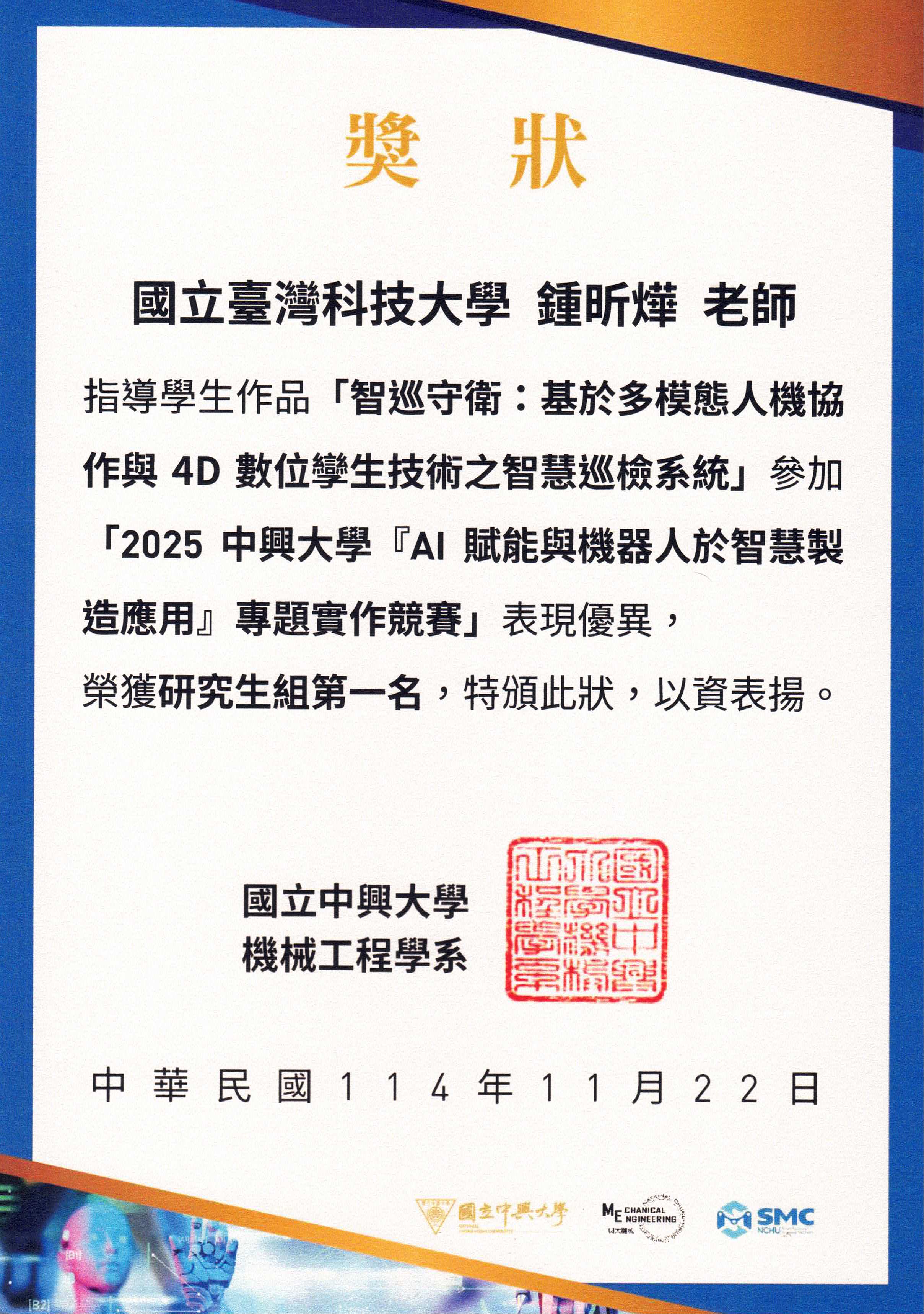 Dr. Sin-Ye Jhong (鍾昕燁) is an Assistant Professor at the Graduate Institute of Intelligent Manufacturing Technology (GIMT) at the National Taiwan University of Science and Technology (NTUST), where he leads the ASI² Lab. He also serves as an AI Application Consultant at Power Data Co., Ltd., working to translate advanced AI theories into real-world deployments. If you are interested in joining our team as a graduate student or collaborating on industrial solutions, please visit our contact page for more information.